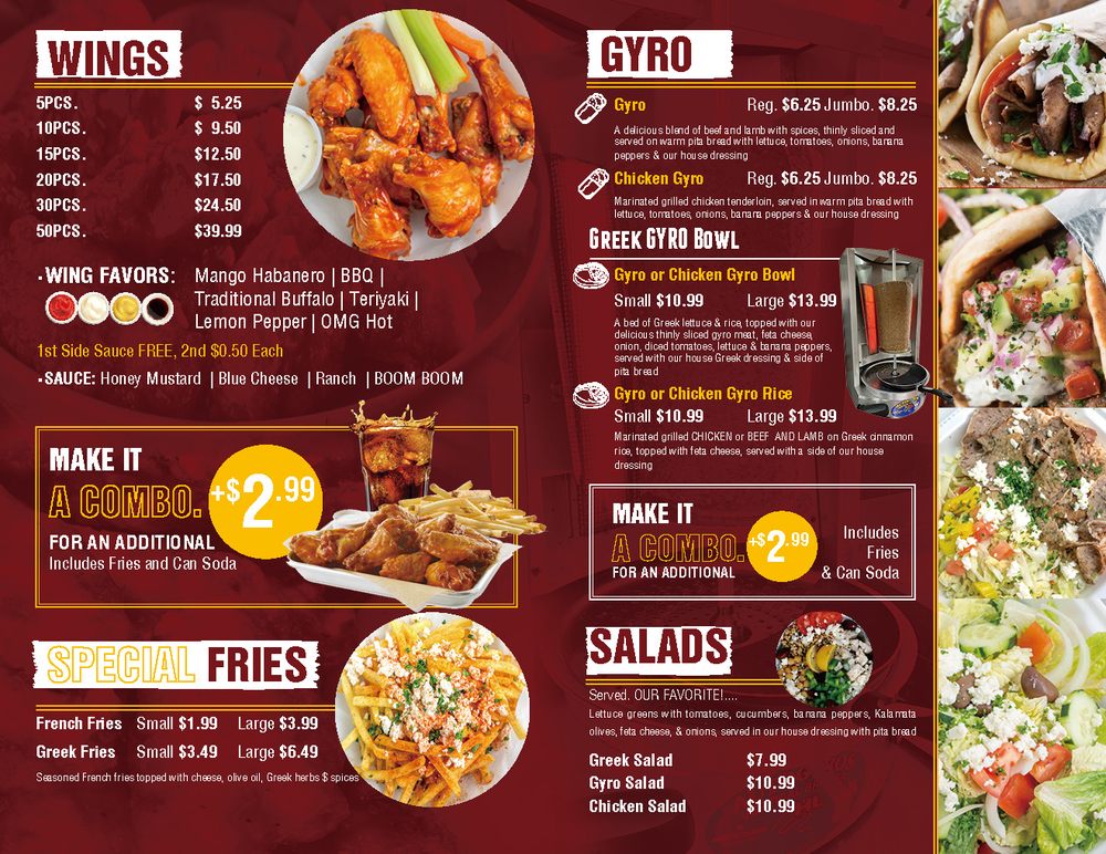 Served with Middle Eastern flavored lame on warm pita bread with lettuce, tomatoes, onions, cucumbers, topped with our famous white sauce and hot sauce.Comes with a 12oz drink.